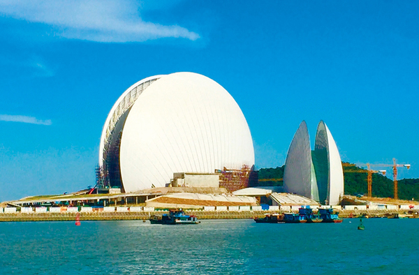 中国.一建设在海岛上的歌剧院——珠海歌剧院2010年4月28日将动工建设,选址位于情侣路野狸岛海滨,凭海临风,选址.具.色。该项目规划用地面积5万平方米,总建筑面积约5万平方米,投资估算约10.8亿元.币。2013年12月29日主体结构封.。