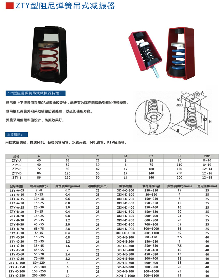吊式弹簧快猫成人网站入口器采用冲压成型加工,配合合成橡胶零组件组合,外观为静电涂装处理,并经盐雾试验严格品管;结构美观,上下端均增加CR材质橡胶件,进一步隔绝振动及噪音。为吊挂式空调设备、风机及大小管路等各种吊式设备所采用。上海快猫在线观看快猫成人网站入口器有限公司生产的ZTY型吊式弹簧减振器在市场上均有广大和良好的快猫APP短视频下载。经过厂家多年的研发和改良,快猫成人网站入口效果基本可达95%—100%。
